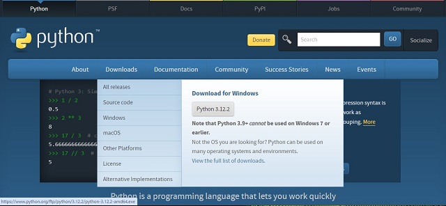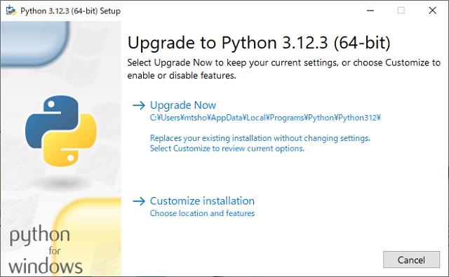 初めてダウンロードしたときのバージョンが「3.12.2」でした。Python公式サイトを見てみると「3.12.3」がリリースされていたので、アップデートします。